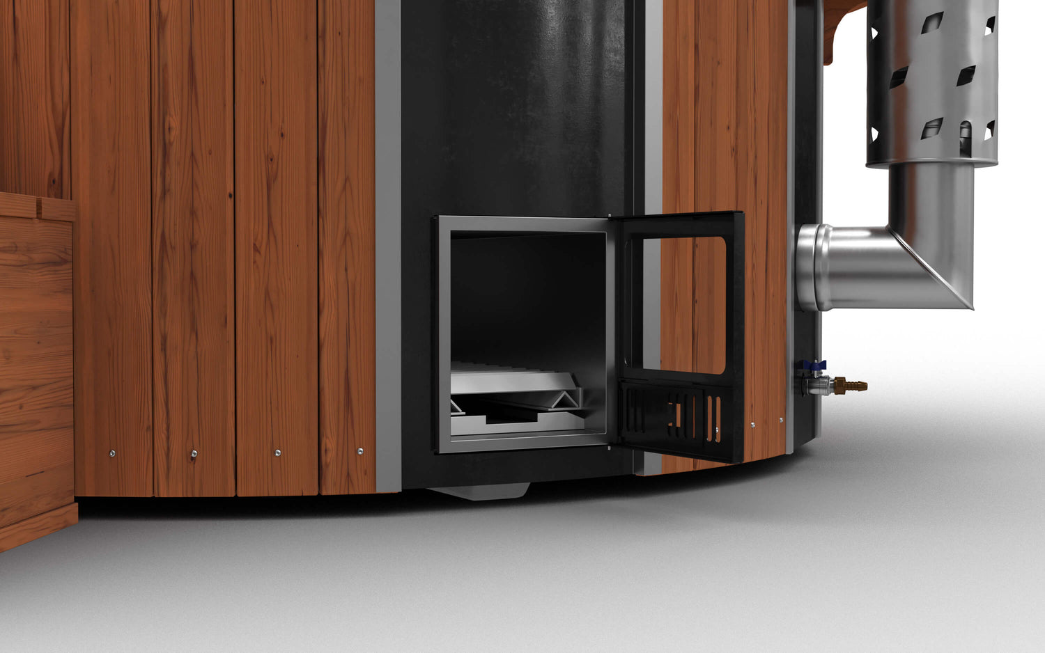 Unser Ofen ist sorgfältig konstruiert, um die Verbrennungseffizienz zu maximieren und die Emissionen zu minimieren. Er besteht aus AISI 316 Edelstahl mit Molybdän, was ihn widerstandsfähiger gegen Korrosion macht als AISI 304. Dadurch kann das holzbeheizte Badefass sowohl mit Chlor als auch mit natürlichen Salzgehalten aus Meerwasser verwendet werden. Das Ofendesign nutzt zudem die Wärme des Rauches, um das Wasser schneller zu erwärmen.