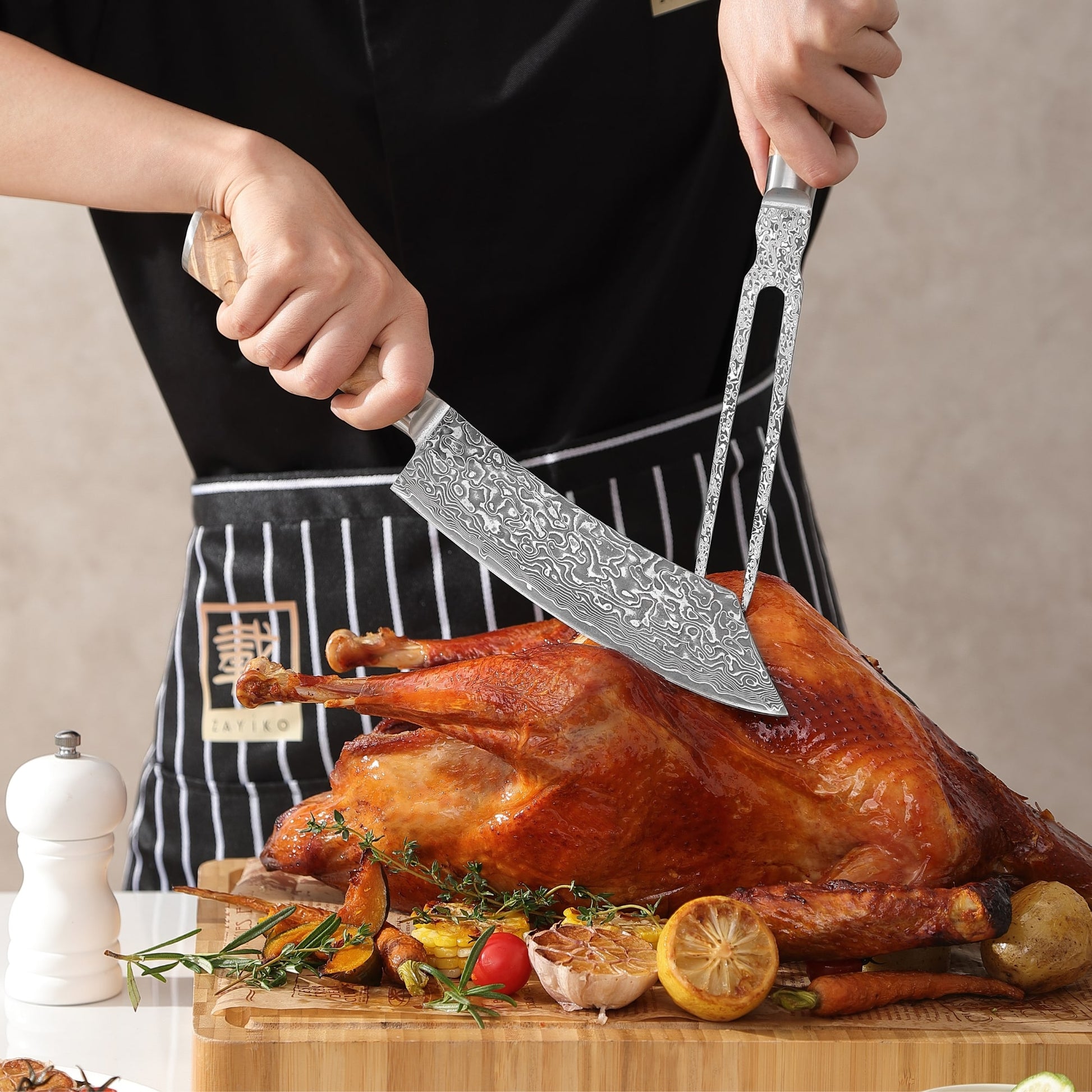 Zayiko 2er Damaszener Tranchier-Set | Perfekt für Braten und Grillgut | VG-10 mit Birke Wurzelholzgriffen | Edle Geschenkbox inklusive
