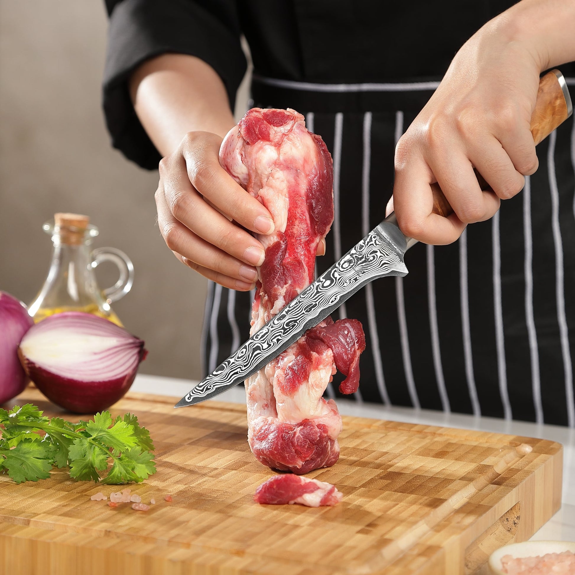 Damaszener Ausbein- und Filetiermesser | Klingenlänge 16 cm | Griff aus edlem Birken Wurzelholz | Für Fleisch und Fisch | Inklusive hochwertiger Geschenkverpackung