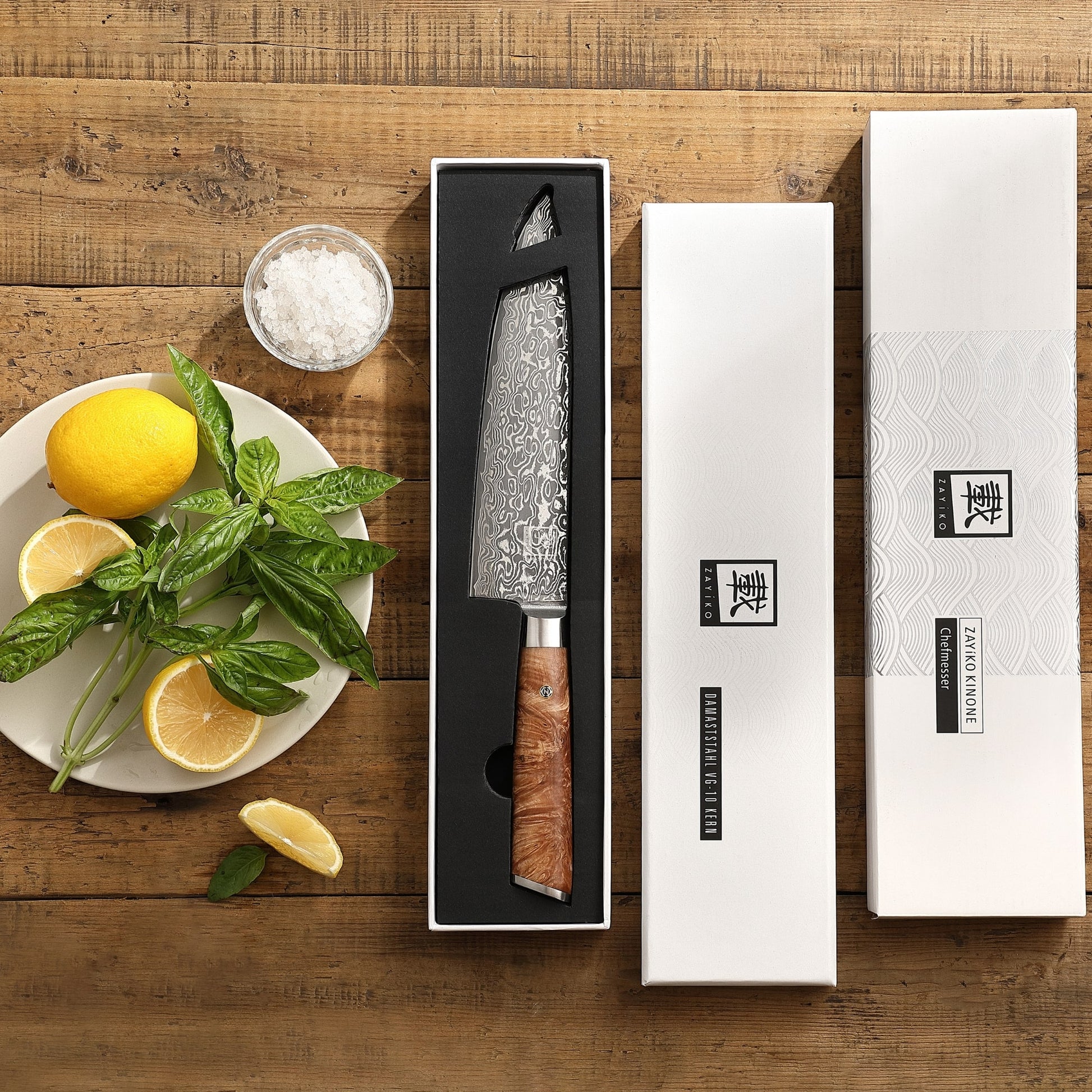 Verleihen Sie Ihrer Küche mit dem Zayiko Kinone Damast Chefmesser eine neue Dimension von Schärfe und Funktionalität. Jedes Messer wird in einer hochwertigen Geschenkverpackung geliefert, die seine Einzigartigkeit unterstreicht. Überzeugen Sie sich selbst von der Exzellenz der Zayiko Kinone Serie und erleben Sie Schneidergebnisse, die Ihre Erwartungen übertreffen.