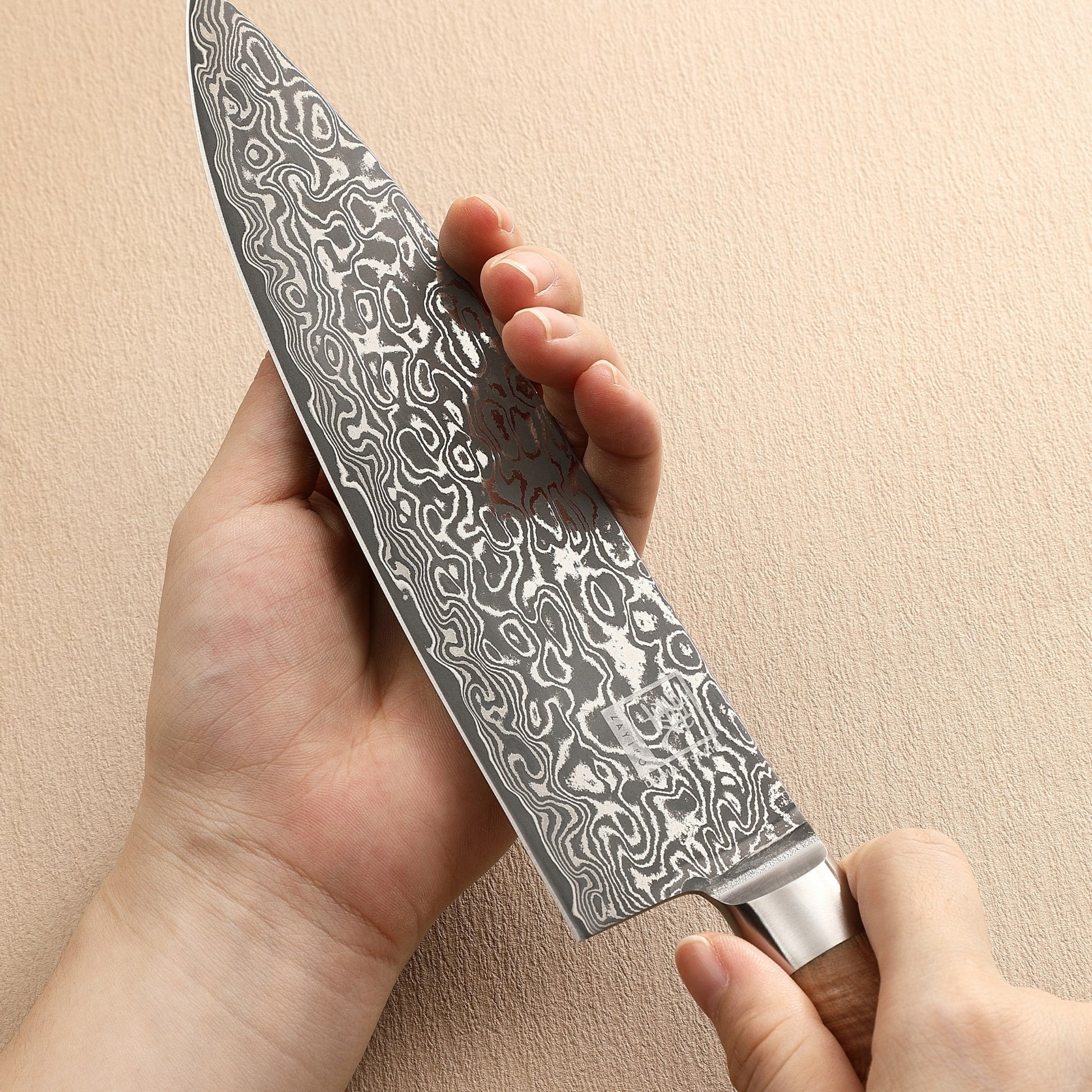 Die 20 cm lange Klinge des Zayiko Kinone Chefmessers wird aus 67 Stahllagen original japanischem schwarzen Damaszenerstahl mit VG-10 Stahlkern gefertigt. Mit einem Härtegrad von 60±2HRC ist diese Klinge nicht nur präzise, sondern auch äußerst robust. Jede Stahllage wird sorgfältig gewickelt, wodurch die einzigartige Maserung und Struktur entstehen, die jedes Messer zu einem Kunstwerk machen.