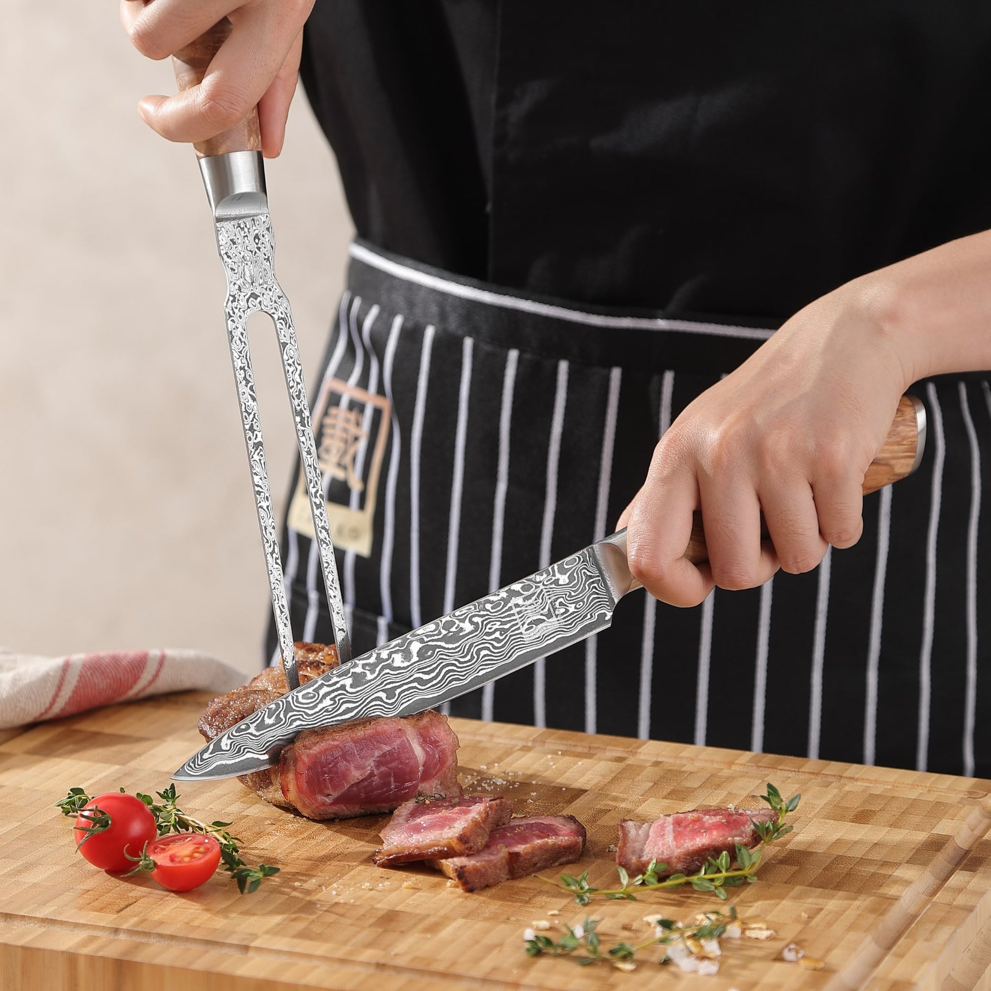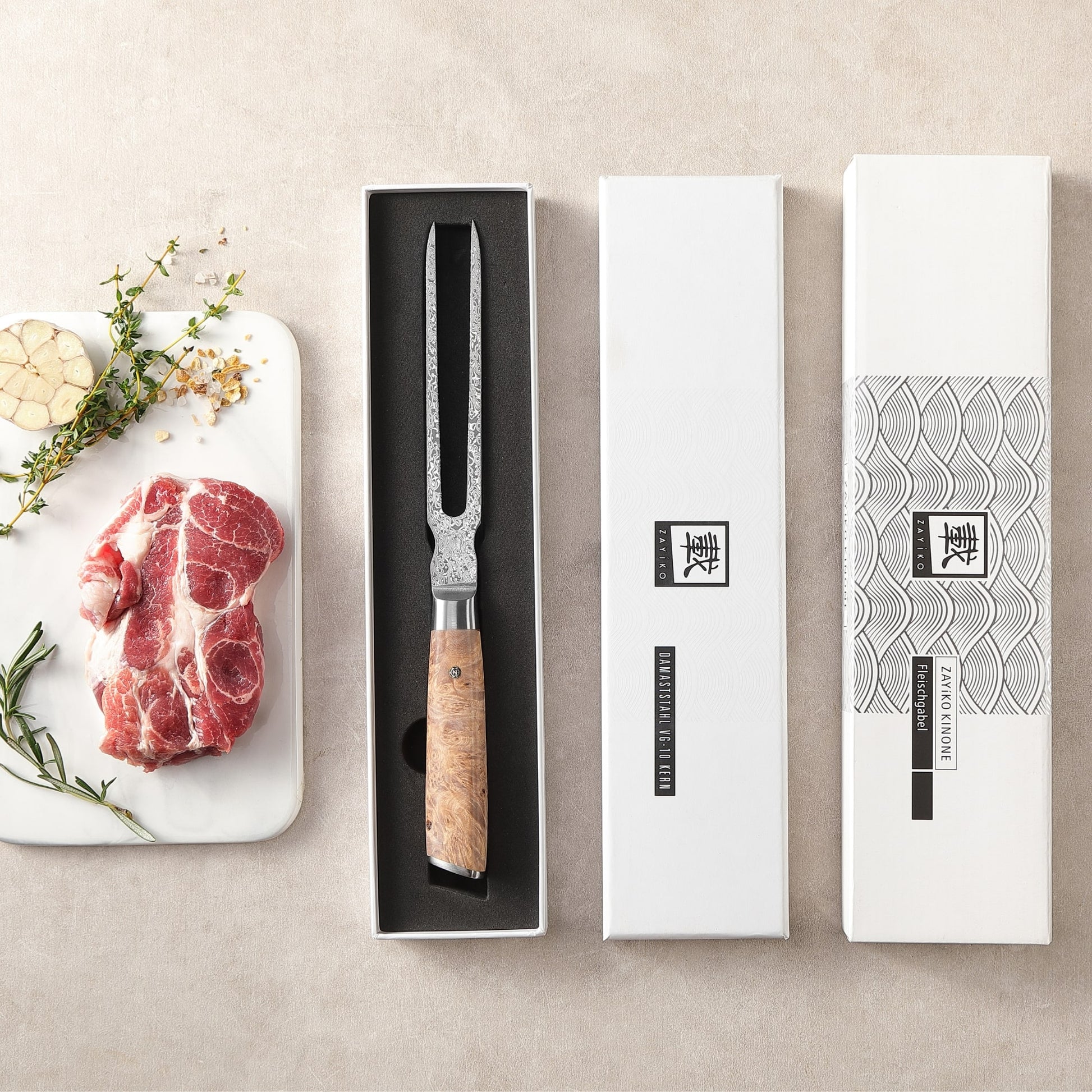 Zayiko Damast Tranchiergabel | Zinkenlänge 18 cm | Griff aus Birken Wurzelholz | Zum Tranchieren, Festhalten und Wenden | Inklusive hochwertiger Geschenkverpackung