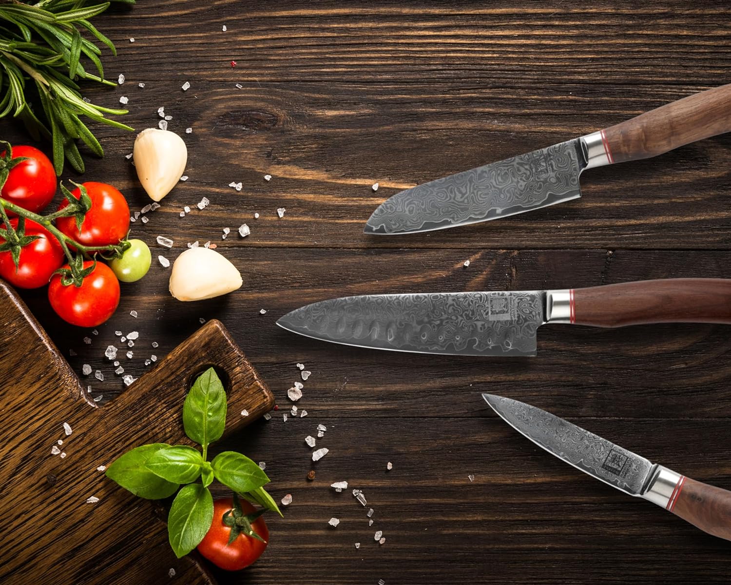 Zayiko 3er Damastmesser-Set - VG10 Stahlkern, Nussbaumgriffe, in edler Holzbox