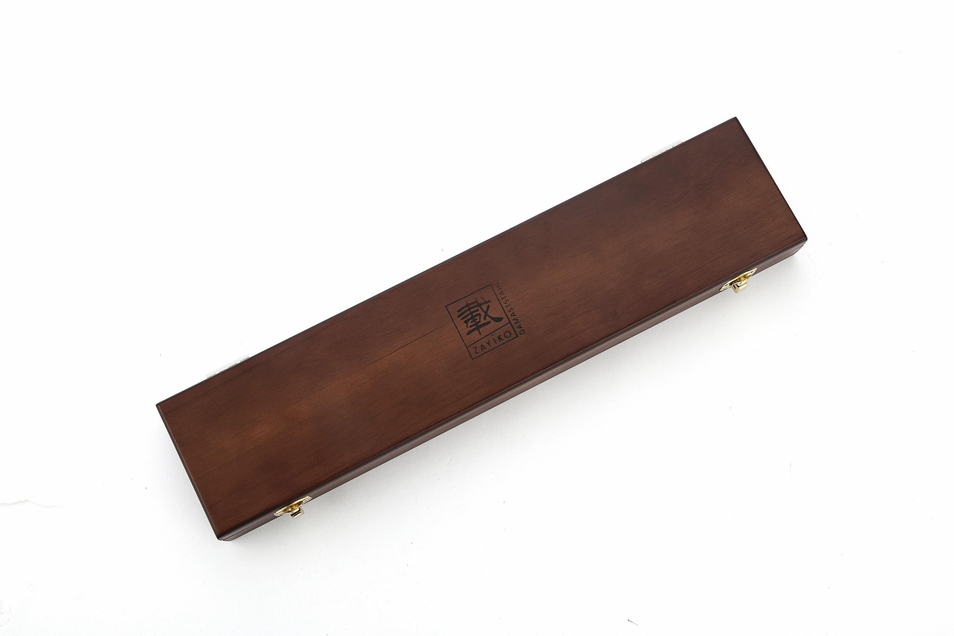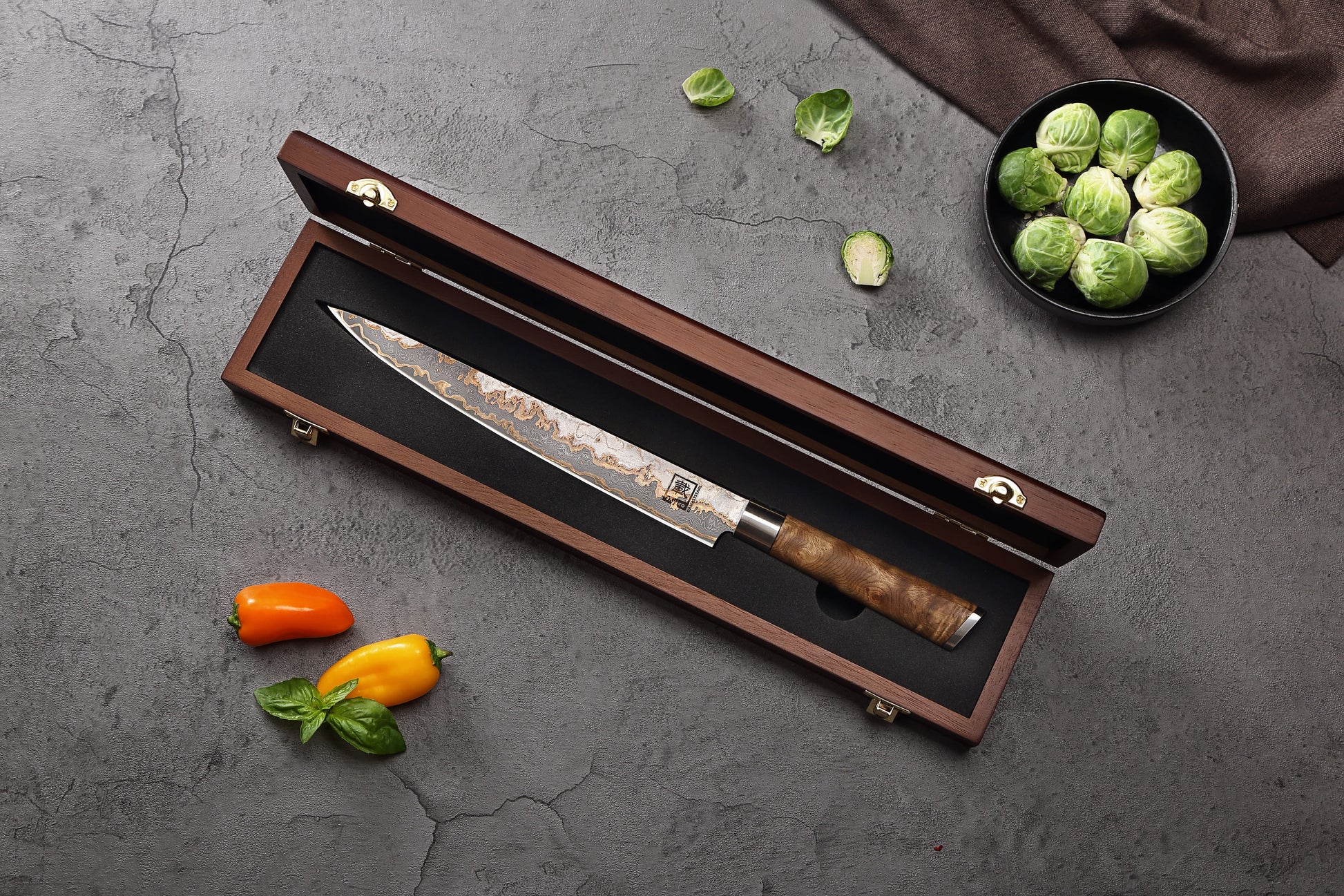 Das Sashimi Messer wird in einer hochwertigen Holzbox geliefert, die nicht nur optimalen Schutz bietet, sondern auch eine stilvolle Präsentation ermöglicht. Dieses Messer ist nicht nur ein unverzichtbares Werkzeug in jeder Küche, sondern auch ein ideales Geschenk zu Weihnachten oder zum Geburtstag.
