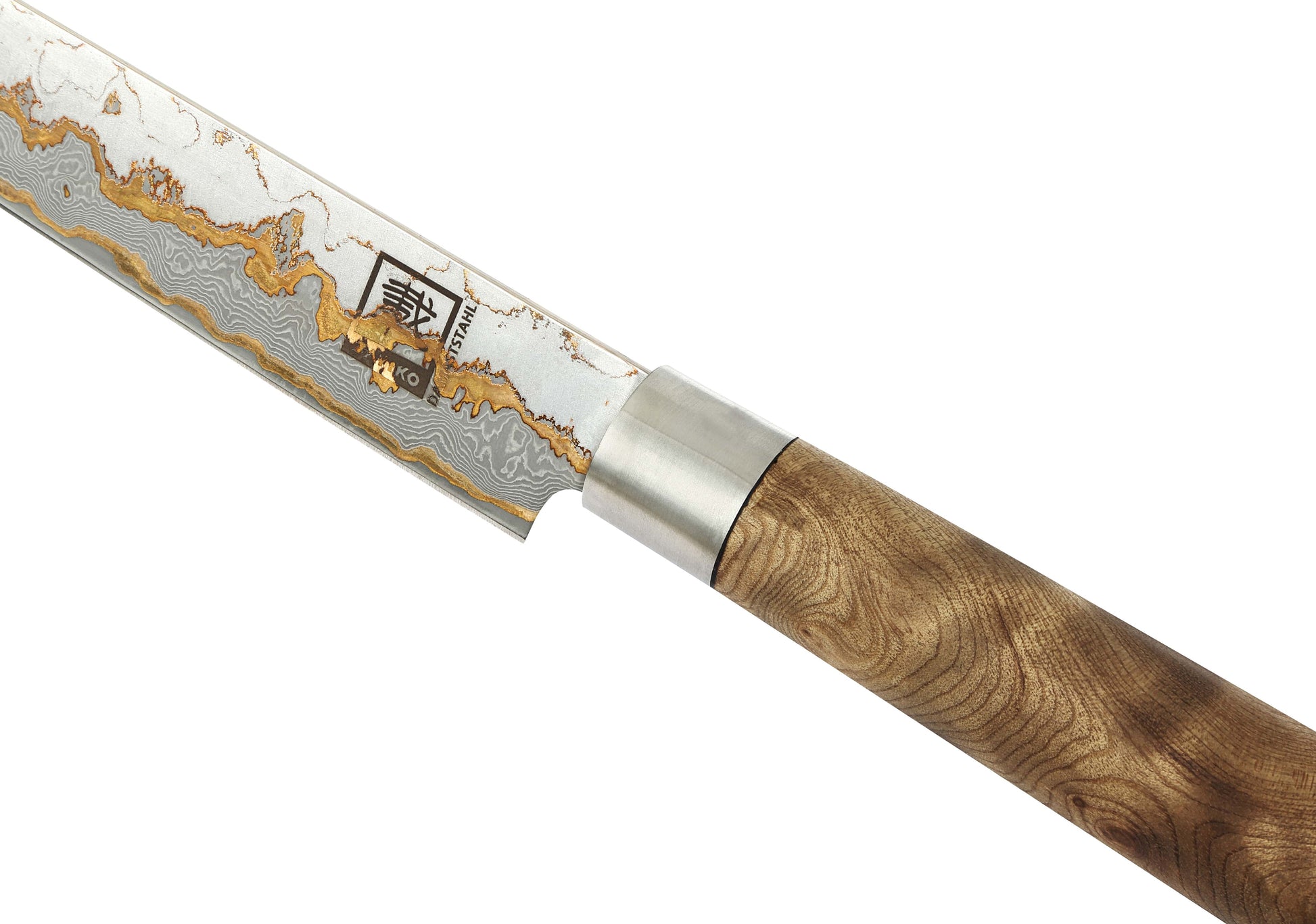 Die mehrfach gewickelten Stahllagen machen jedes Messer zu einem einzigartigen Kunstwerk. Der Griff aus edlem Ahornwurzelholz vereint zeitlose Eleganz mit ergonomischem Design und liegt perfekt in der Hand. Die Kombination von traditioneller Handarbeit und moderner asiatischer Schmiedekunst führt zu einem extrem harten und langlebigen Produkt, das länger scharf bleibt und sich im täglichen Einsatz bewährt.