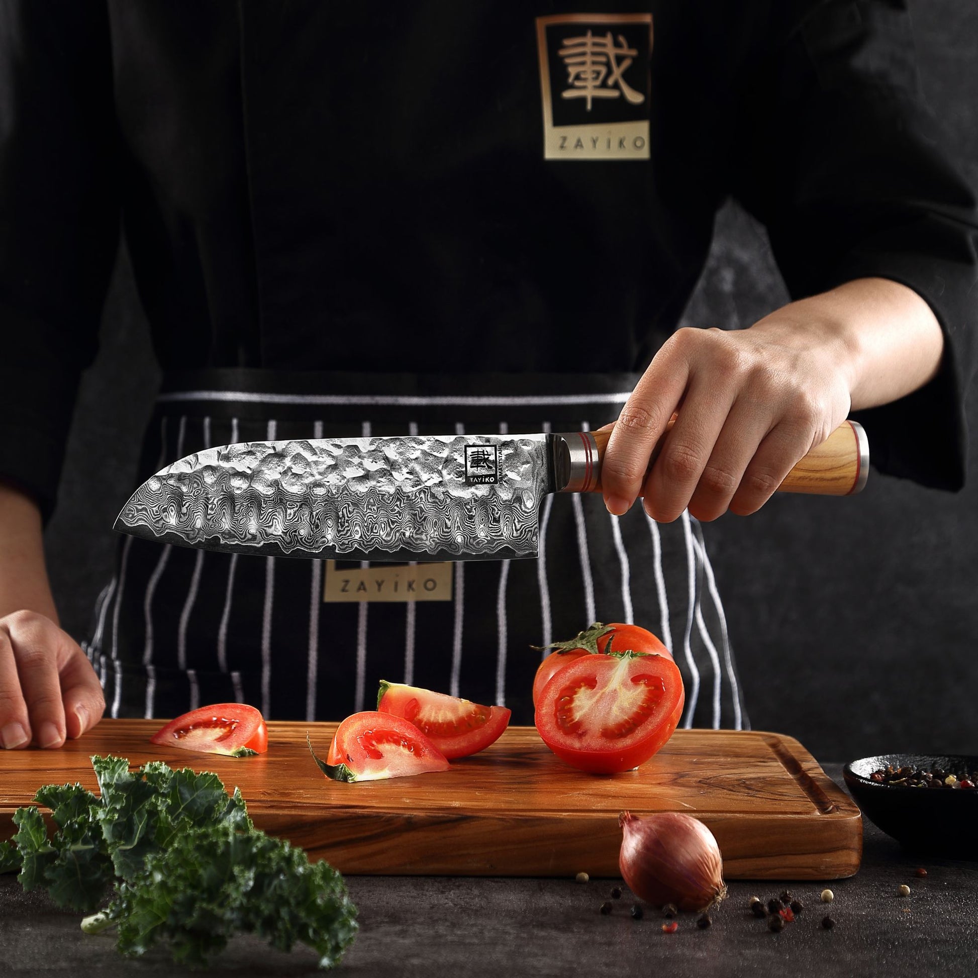 Unsere Zayiko Damastmesser gehören zu den schärfsten Messer-Serien der Welt. Das Santokumesser aus der Serie Zayiko Olive ist die erste Wahl anspruchsvoller Hobbyköche, denn es macht das genaue Arbeiten mit Fisch, Fleisch, Gemüse und Obst zum mühelosen Vergnügen.