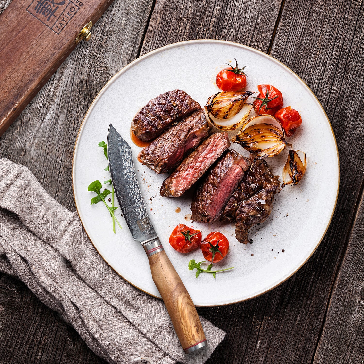 Damast 4er Steakmesser-Set Zayiko Olive | Klingen 12 cm Länge mit Hammerschlag | Inklusive hochwertiger Holzverpackung
