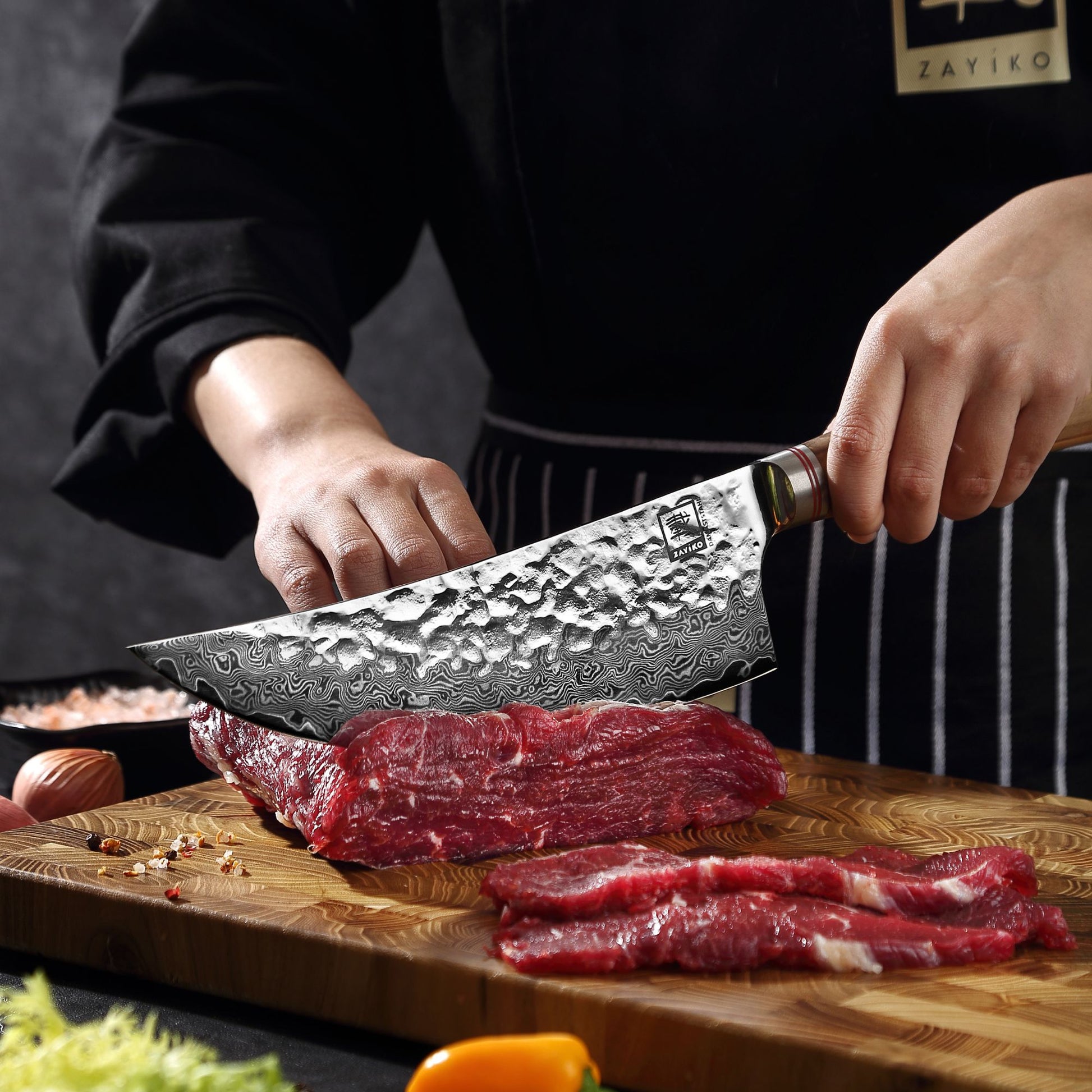 Zayiko Olive Damast Chinesisches Wiegemesser Klinge 20 cm Länge - sehr hochwertiges sehr scharfes Profi Kochmesser mit Olivenholzgriff